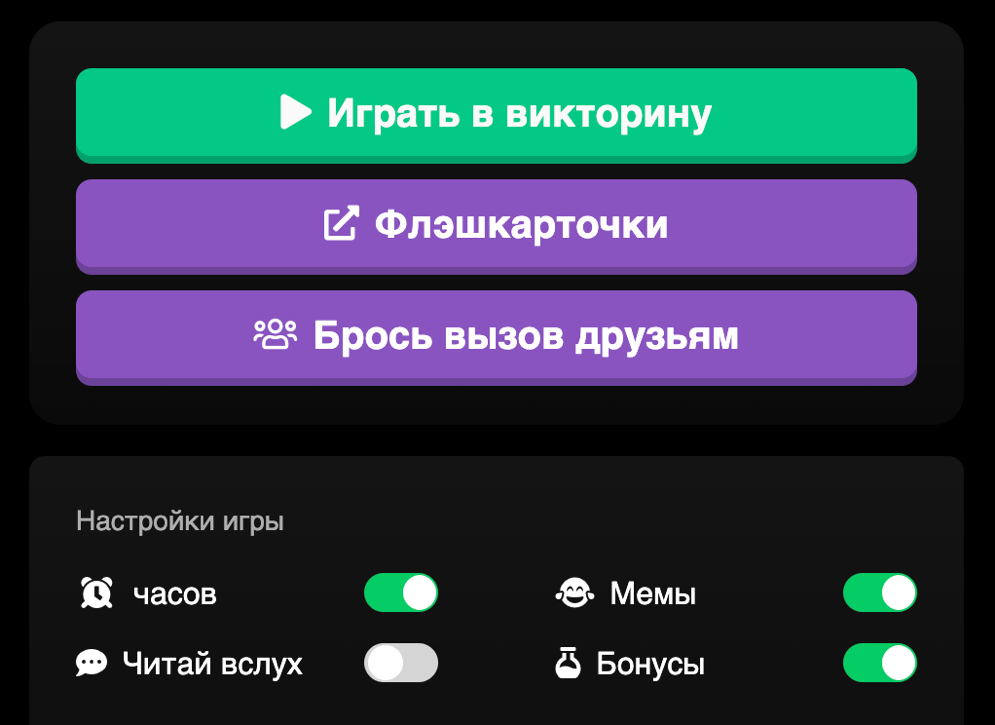 • По умолчанию в игре будут поддерживаться мемы и бонусы – это значит, что после каждого отвеченного вопроса студент будет видеть мем, а при особых достижениях (к примеру, если студент правильно ответил на несколько вопросов подряд) ему будут добавляться бонусы – например, бонус «Иммунитета» (см. ниже). При желании эти функции можно отключить в настройках игры.